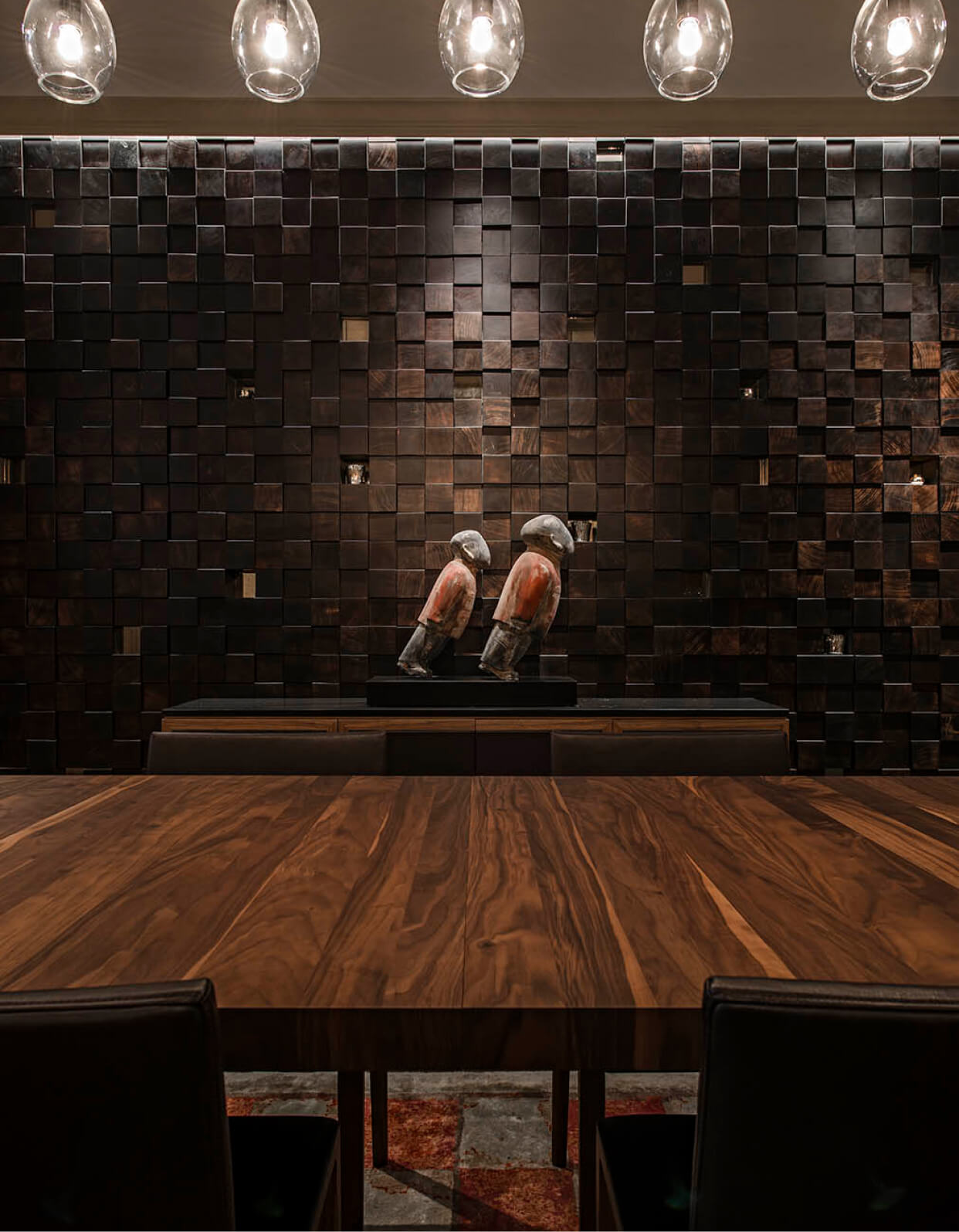 Full-height glazing floods the space with natural light, while warm timber joinery and concealed lighting create an atmosphere of intimacy and focus. A statement fireplace anchors the room, complemented by elegant acoustic treatments and custom shelving designed to celebrate both books and objects.